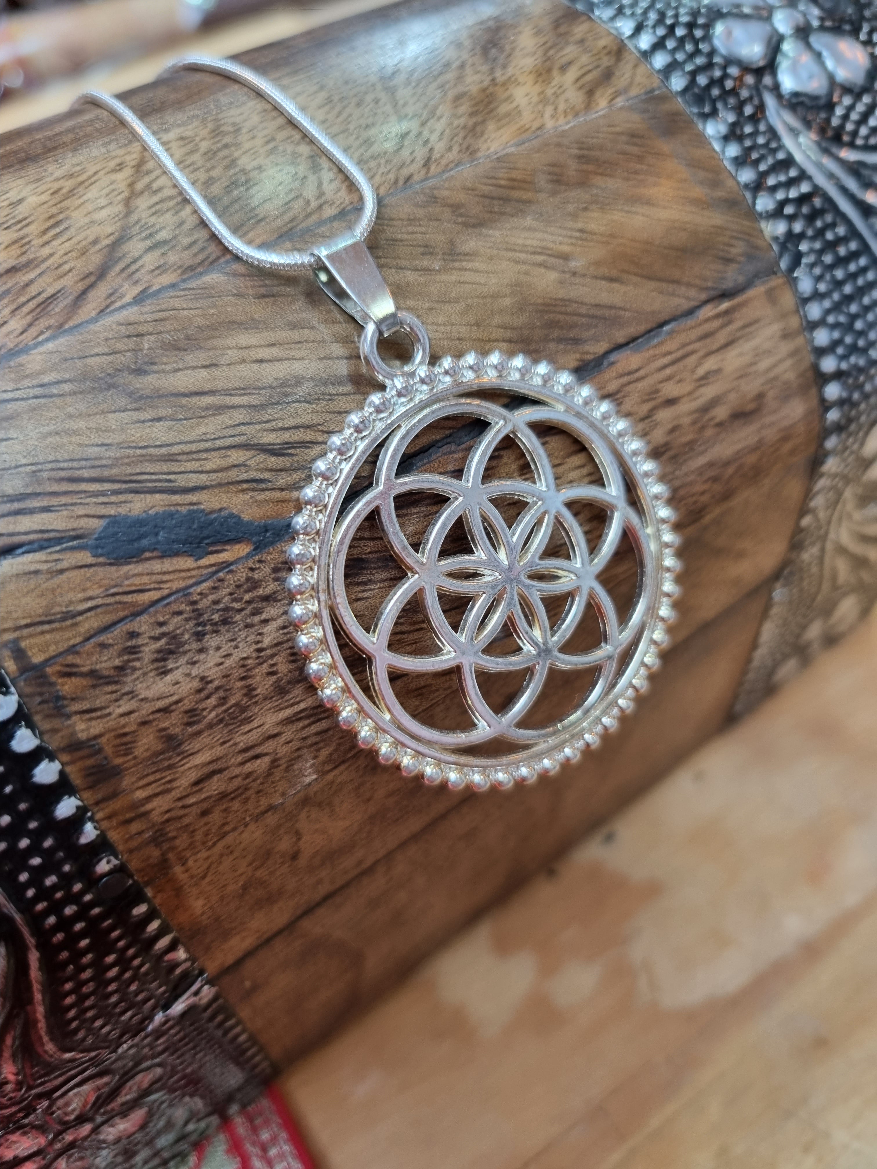Round Silver Om Symbol Earrings On Flower Of Life Background
